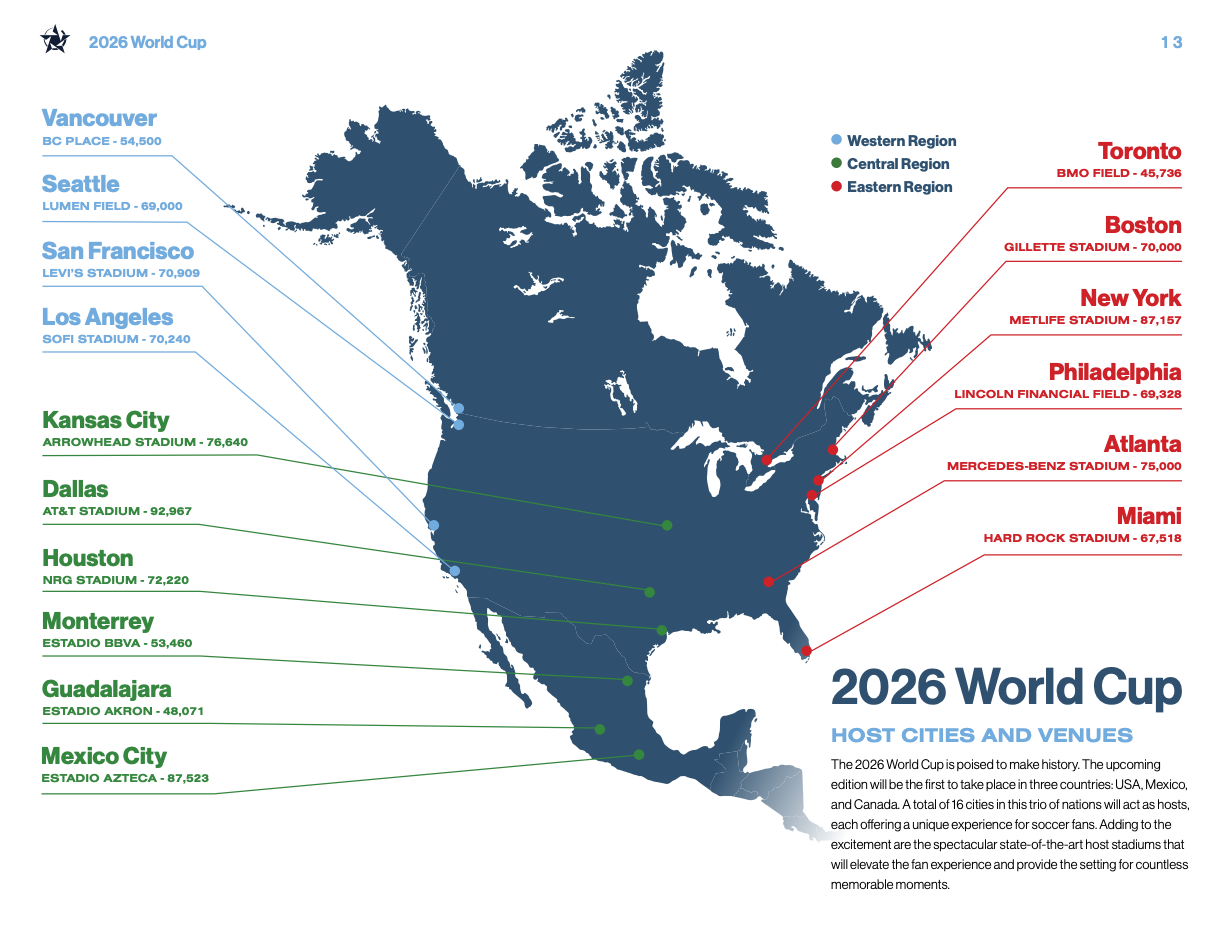 Matches are spread across three major regions in the United States (East, Central, West) along with key cities in Mexico and Canada. Fans can base themselves in one hub or follow their team between multiple cities.