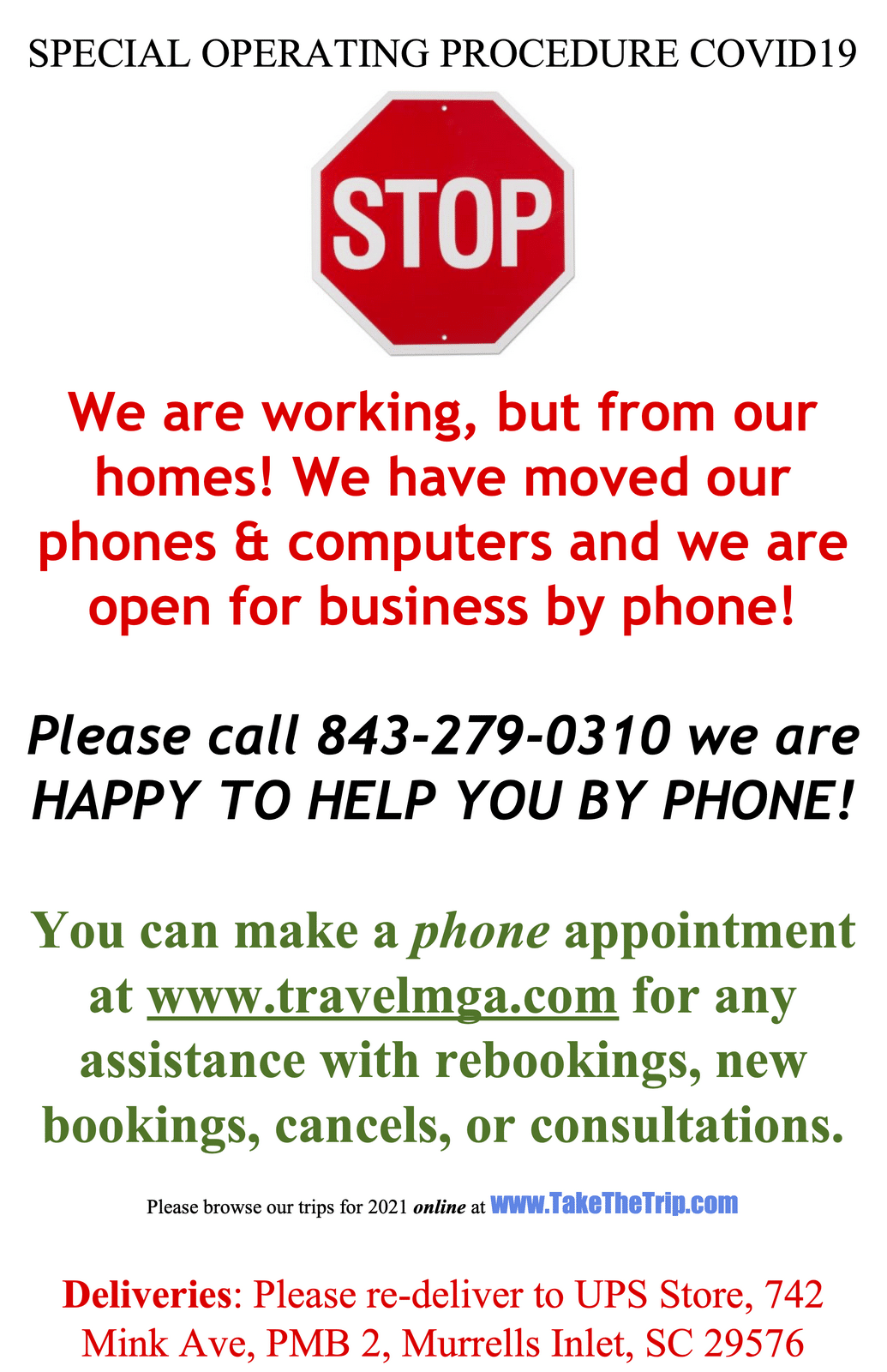 We’re currently helping numerous clients navigate their options due to complications from the Covid-19. We are working with current strategies for mitigating affected upcoming travel plans but the situation is fluid and things are changing quickly. If your travel dates are coming up in the next 30 days, and you stated in your email that you need assistance or information now, we will reach out to you as soon as possible. If your travel plans are beyond 30 days away, we appreciate your patience as we first tend to those traveling sooner. We are committed to giving each of you the attention you deserve. We also wish to advise you that MGA Travel will continue to be here to serve your needs, we have currently moved to a work-from-home scenario. Our physical office location will reopen when the current situation has stabilized, but we feel it is important to join the social distancing effort to stop the spread of COVID-19. Here are the ways you can reach us: Phone: 843-279-0310Email: office@takethetrip.com What’sApp: 843-279-0310 Facebook Messenger: https://www.facebook.com/TakeTheTripTravel Please note that your itinerary is often made up of many components that include accommodations (hotel/lodges), transfers, sightseeing with tour guides, various ground operators as well as international and internal flights, and/or cruises. It is therefore necessary to point out that we as a business can only pass on credits and rebooking / cancellation policies that we can negotiate with all of these operators, which do vary. Please take care of yourself and your family! We truly believe we will come out of this stronger than ever! Stay tuned, stay safe, and stay well! Best,MichaelPresident, MGA Travel