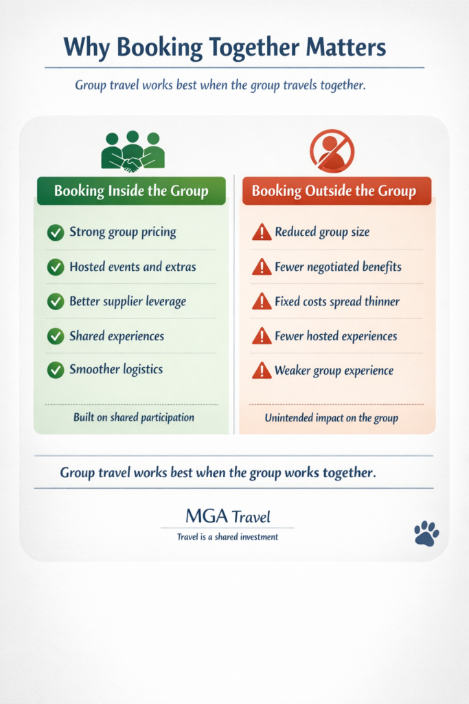 This is not about control or exclusivity. It is about how group travel actually functions behind the scenes and why booking within the group benefits the entire club.