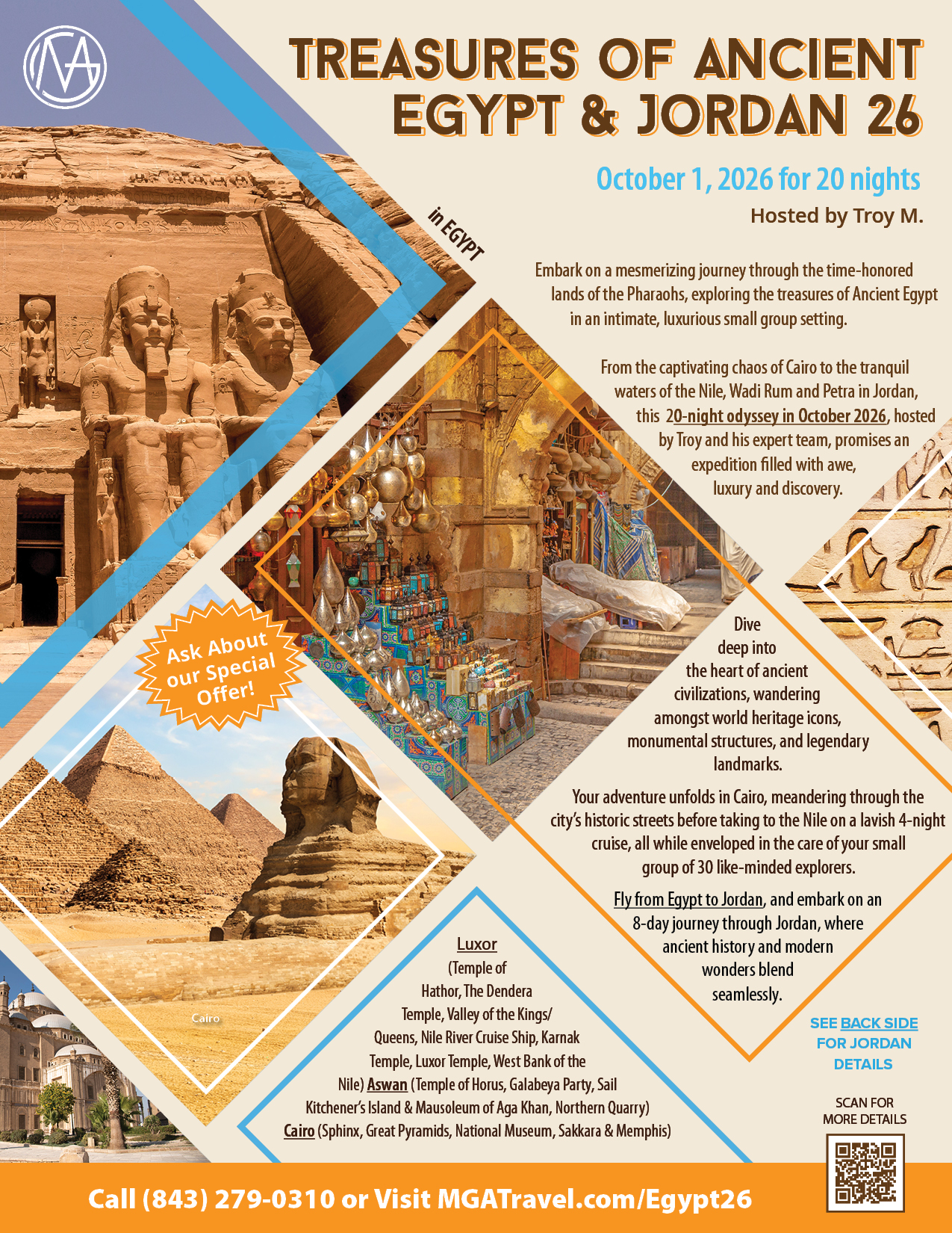 October 1, 2026 for 20 nights, hosted by Troy M on a mesmerizing journey through the time-honored lands of the Pharaohs, exploring the treasures of Ancient Egypt and the Jewels of Jordan, in an intimate, luxurious small group setting.