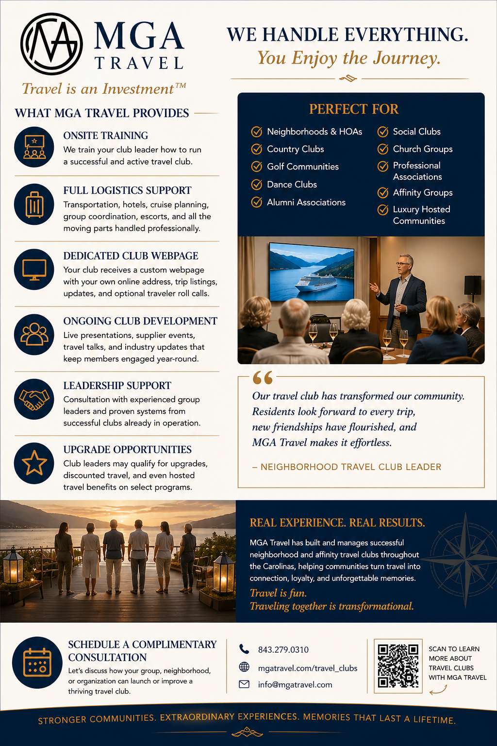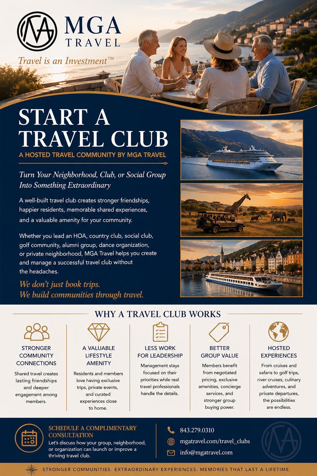This is a turn-key travel club program designed by group travel experts and travel club veterans. It can be a valuable amenity for your neighborhood, association, or social group. The goal is to assist your community with creating and growing your travel club into an active and rewarding group. Travel is fun and traveling together creates lasting memories, with the result being a happier community. The travel clubs we have created are very popular with most group members and management is free to concentrate on other endeavors, knowing that the travel club is being managed by real travel experts.